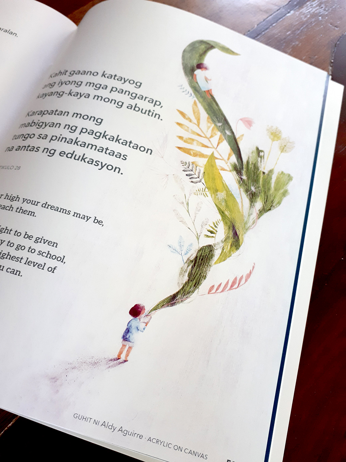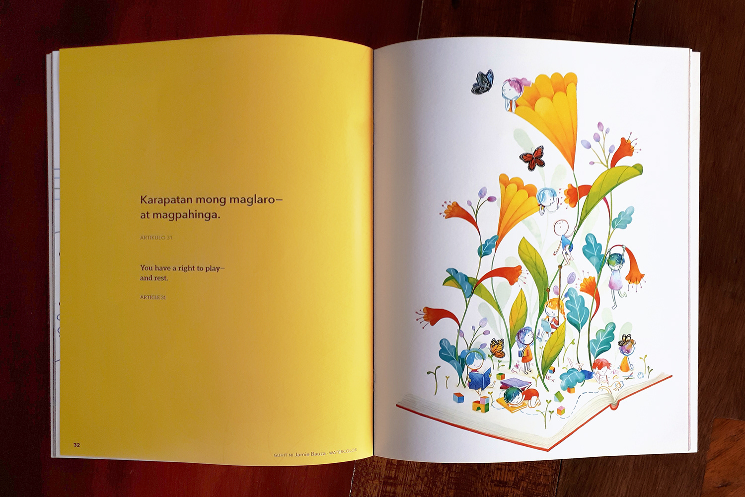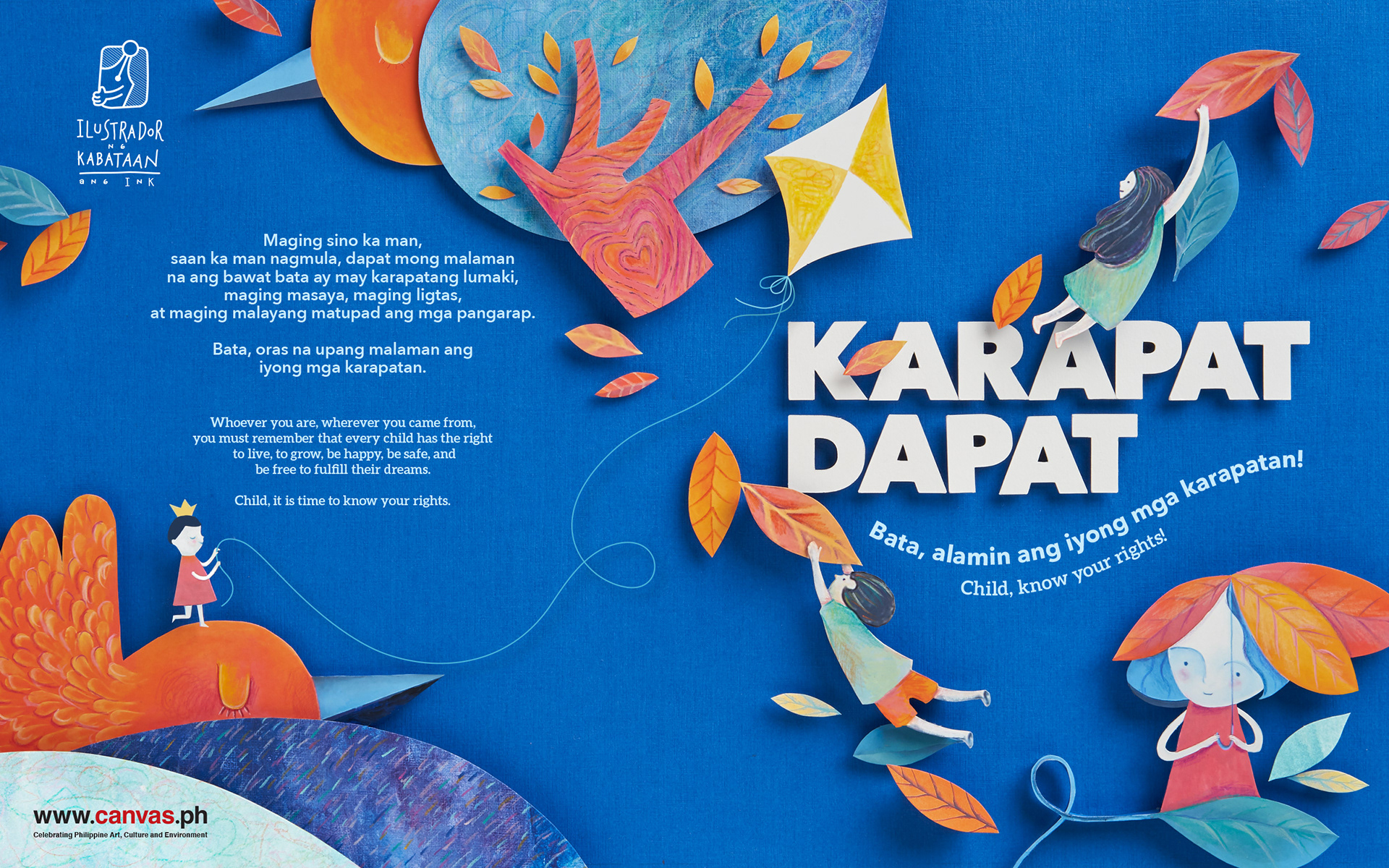 This book was inspired by the United Nations Convention on the Rights of the Child, a human rights treaty which sets out the civil, political, economic, social, health, and cultural rights of children, which was adopted by the United Nations General Assembly in 1989, and ratified by the Philippines a year later. It is the first legally binding international convention to affirm human rights for all children. To help children learn about their rights, selected articles from the treaty were rewritten in child-friendly language and colorfully brought to life by the country’s best children’s book illustrators. This book was a product of the close collaboration between the Center for Art, New Ventures & Sustainable Development (CANVAS) and Ang Ilustrador ng Kabataan (Ang INK).