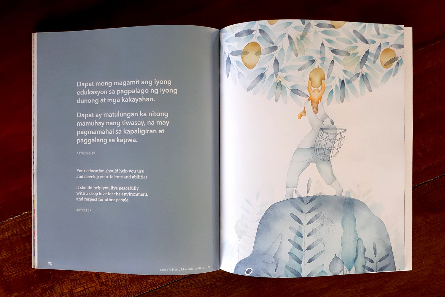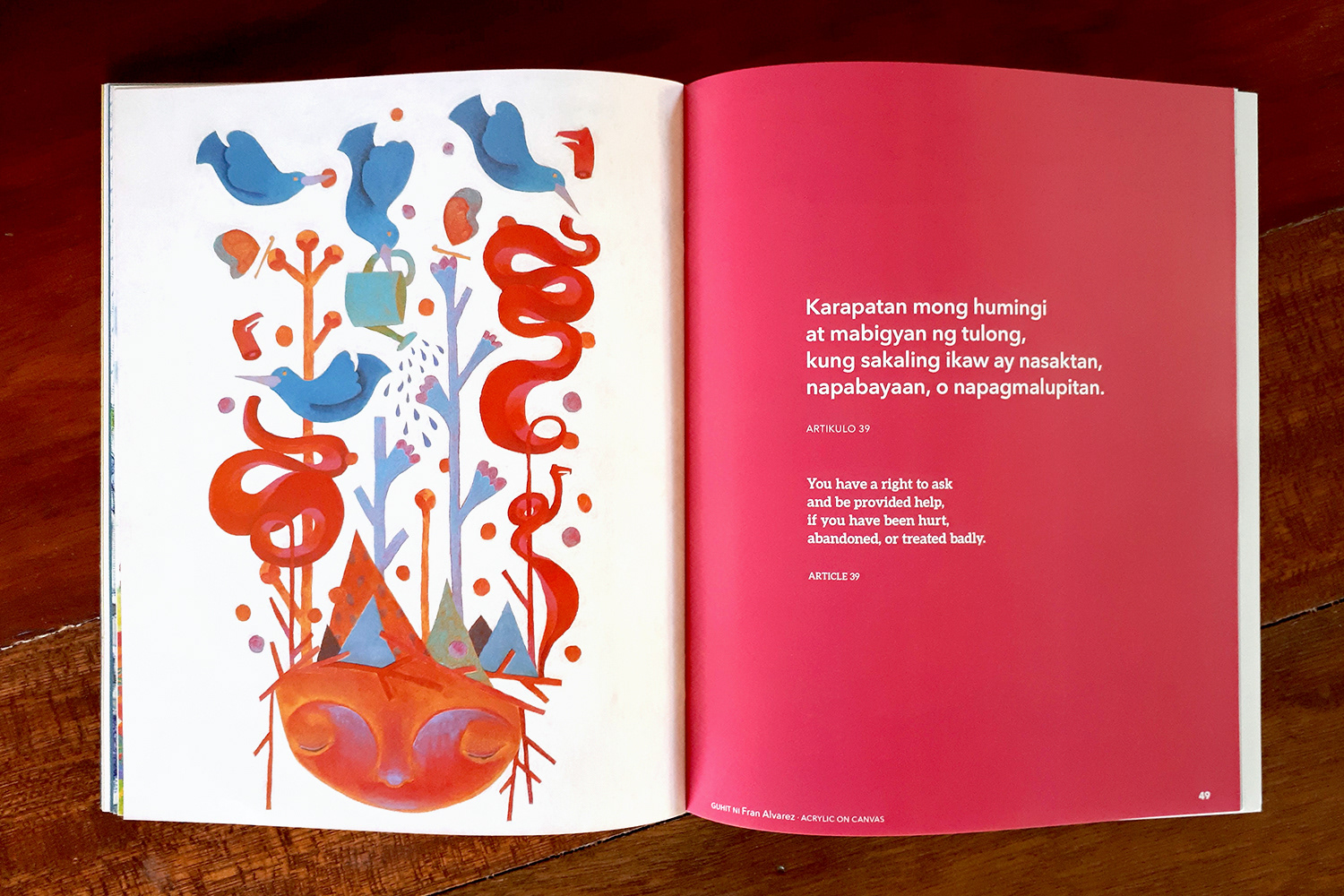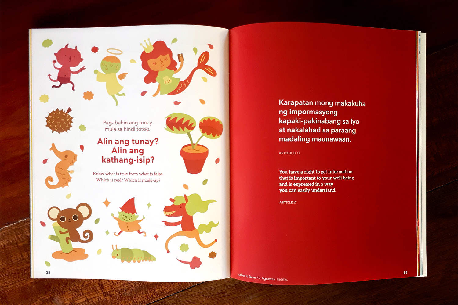 This book was inspired by the United Nations Convention on the Rights of the Child, a human rights treaty which sets out the civil, political, economic, social, health, and cultural rights of children, which was adopted by the United Nations General Assembly in 1989, and ratified by the Philippines a year later. It is the first legally binding international convention to affirm human rights for all children. To help children learn about their rights, selected articles from the treaty were rewritten in child-friendly language and colorfully brought to life by the country’s best children’s book illustrators. This book was a product of the close collaboration between the Center for Art, New Ventures & Sustainable Development (CANVAS) and Ang Ilustrador ng Kabataan (Ang INK).