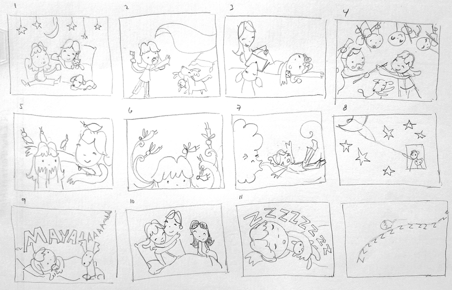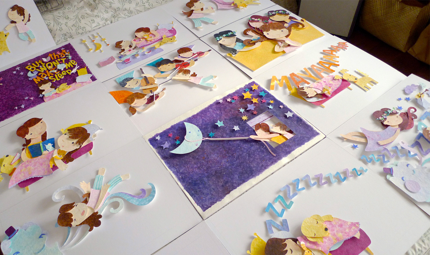 Making the book: Thumbnails, partly assembled pieces, and final spreads