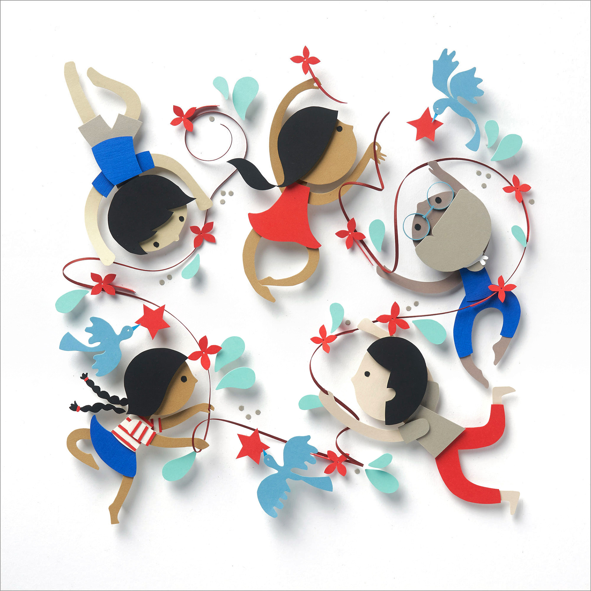 From the family’s bunso to the lola, members gather around to string together a garland of santan flowers and leaves. The activity brings them together and allows them to connect with gifts from the natural world while sprucing up a home for the holidays. Birds flying in with stars add a nice touch to the garland.